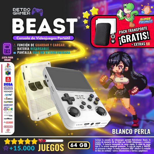 Retro Gamer® SUPER: Tarjeta de memoria de 64GB con 30,000 juegos incluidos + 2 controles inalámbricos (requieren 2 baterías AAA cada uno). Soporta juegos de 39 emuladores incluyendo N64, NDS, PS1, Mega Drive, Neo Geo, Neo Geo Pocket, Atari, GB, GBC, GBA, MAME, SEGA DC, SNES, NES, ARCADE y más. Plus: Capacidad de cargar tus propios juegos desde un ordenador a tu consola. Guarda los avances del juego.